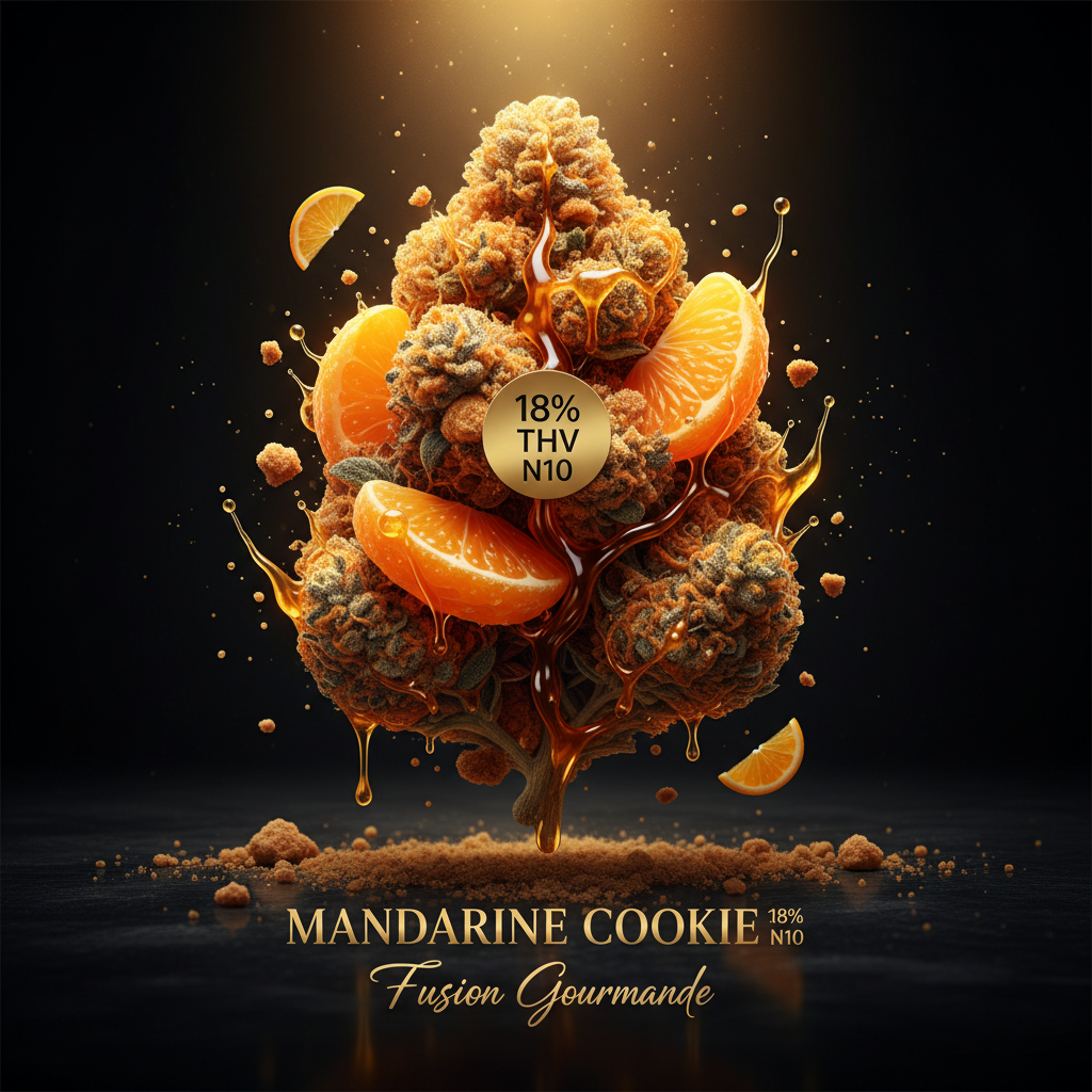 Mandarine Cookie – Fusion gourmande avec 18% de THV N10. Saveurs d’agrumes frais et de cookie, produit Néo Canna aux arômes uniques.